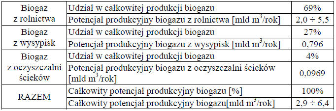 Tabela1. Potencjał produkcyjny biogazu w Polsce