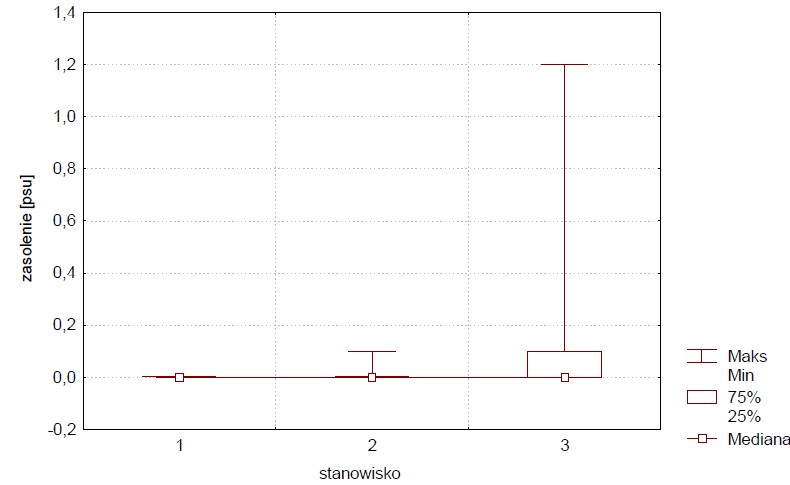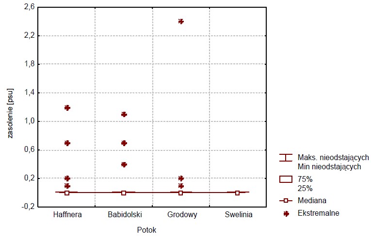 Zasolenie o wartościach wyższych od 0 psu zanotowano na stacjach badawczych wszystkich cieków z wyjątkiem Potoku Swelinia (tab. 5.1). Podwyższone wartości zasolenia występowały głównie w ujściach cieków. Zasolenie na stanowiskach ujściowych okresowo wzrastało do 1,1 psu w wodach Potoku Babidolskiego i Haffnera oraz do 2,4 psu w wodach Potoku Grodowego. Podwyższone wartości tego parametru od 0,1 psu do 0,4 psu zarejestrowano w górnym i w środkowym biegu Potoku Haffnera, Babidolskiego i Grodowego w okresie późnej jesieni (listopad i grudzień).
