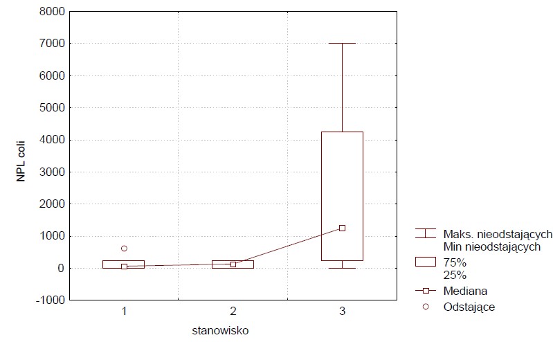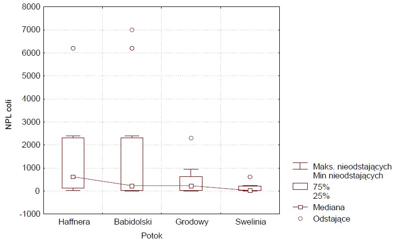 Przeprowadzone testy ANOVA rang Kruskala-Wallisa i Chi-kwadrat nie wykazały istotnych zmian NPL coli wzdłuż biegu Potoku Haffnera, Grodowego i Swelinia (tab. 5.2). Istotne różnice na poziomie p = 0,02 i p = 0,04 uzyskano za pomocą testu U Manna- Whitneya dla Potoku Babidolskiego pomiędzy stanowiskiem ujściowym B3, a stanowiskami B1 i B2 (rys. 5.10). Ponadto wykazano istotne różnice w wartościach NPL coli pomiędzy poszczególnymi ciekami (tab. 5.3). Najbardziej wyróżniał się Potok Swelinia, który charakteryzował się najniższymi wartościami NPL coli (rys 5.11). Ponadto wykazano, iż potoki Grodowy i Haffnera różniły się istotnie pod względem tego wskaźnika na poziomie p = 0,009.