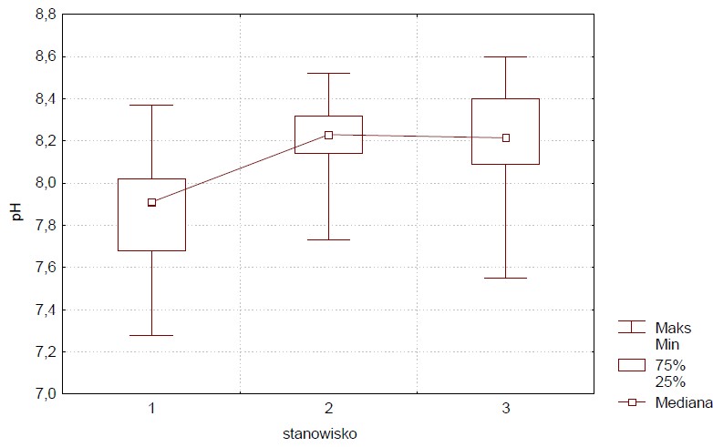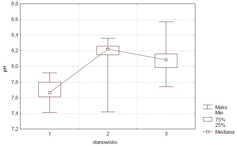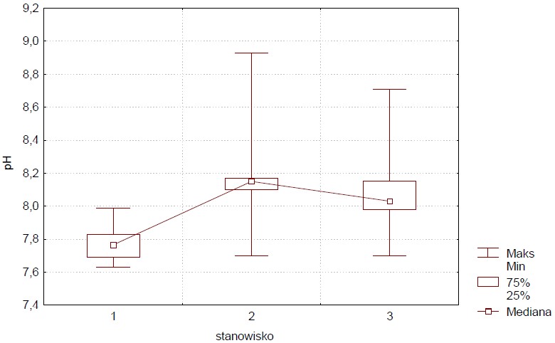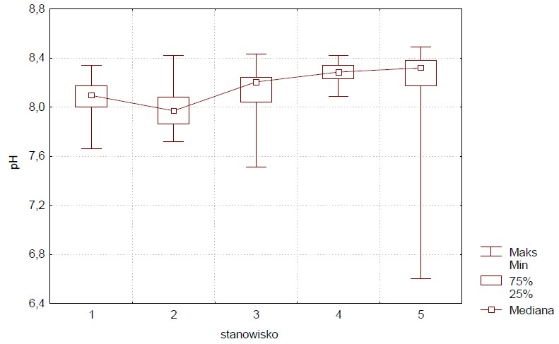 Rysunek 5.3. Odczyn (pH) wody na poszczególnych stanowiskach w Potoku Haffnera.