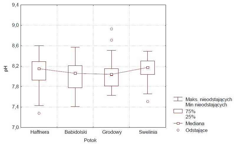Przeprowadzone testy ANOVA rang Kruskala-Wallisa i Chi-kwadrat wykazały istotne różnice pomiędzy wartościami odczynu (pH) wody wzdłuż biegu każdego z cieków (tab. 5.2). W przypadku Potoku Haffnera wykazano za pomocą testu U Manna-Whitneya istotne różnice pomiędzy stanowiskiem H1 (przeważnie o niższym pH wody), a dwoma pozostałymi stanowiskami H2 i H3 (p ~ 0,0) (rys 5.3). Wszystkie stanowiska Potoku Babidolskiego wykazywały istotne różnice względem odczynu (rys. 5.4). Stanowisko B1 (o najniższych wartościach pH) różniło się istotnie od stanowiska B2 (o najwyższych wartościach pH) i B3 na poziomie p ~ 0,0, natomiast stanowisko B2 od stanowiska B3 na poziomie p = 0,006. Podobna sytuacja miała miejsce w przypadku Potoku Grodowego (rys. 5.5). Stanowisko G1 (o najniższych wartościach pH) różniło się istotnie od G2 (o najwyższych wartościach pH) i od G3 na poziomie p ~ 0,0, natomiast stanowisko G2 od stanowiska G3 na poziomie p = 0,034. W przypadku Potoku Swelinia stanowiska S1 i S2 (o najniższym pH) nie różniły się istotnie między sobą. Różnice (p < 0,05) wykazano pomiędzy stanowiskiem S1, a S4 i S5 (o najwyższym pH), pomiędzy stanowiskiem S2, a stanowiskami S3, S4 i S5 oraz stanowiskiem S3 a stanowiskami S4 i S5 (rys. 5.6). Ponadto w wyniku przeprowadzonych testów wykazano istotne różnice (p < 0,05) pomiędzy potokami Haffnera i Swelinia, a potokami Babidolskim i Grodowym (rys. 5.7).