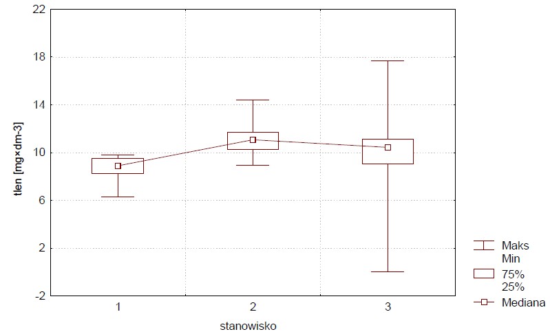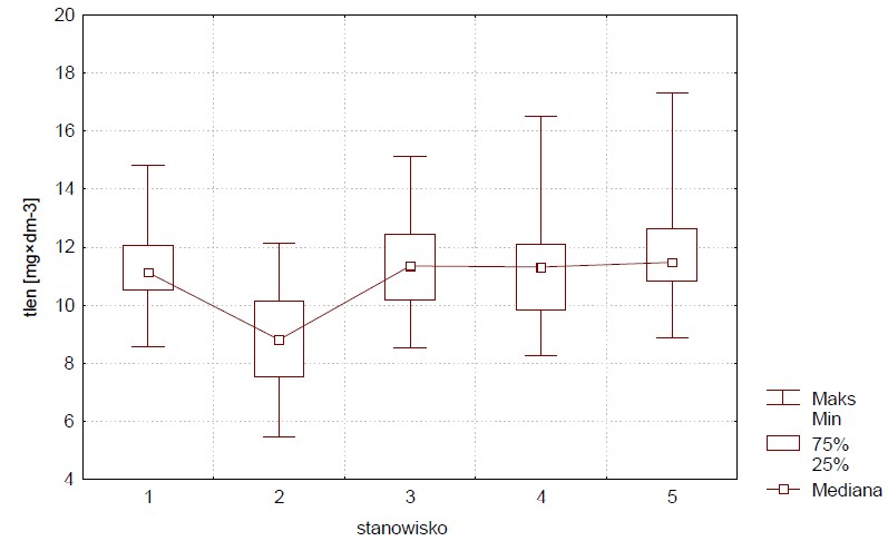 Zawartość tlenu rozpuszczonego w wodzie na stanowiskach usytuowanych wzdłuż biegu cieków (tab. 5.1) zmieniała się w szerokim zakresie od ok. 5,5 mg-dm”3 (stanowisko S2 i H1) do 19 mg-dm”3 (stanowisko H2). Brak tlenu rozpuszczonego zanotowano jedynie na stanowisku ujściowym Potoku Grodowego (G3) w czerwcu 1999 roku. Średnie wartości tego czynnika utrzymywały się na bardzo wysokim poziomie od 8,7 mg O2-dm”3 do 11,4 mg O2-dm”3 i nieznacznie wzrastały wzdłuż biegu cieków. Wyjątek stanowił Potok Swelinia, gdzie na stanowisku S2 obserwowane wartości były przeważnie o 3 mg O2-dm”3 niższe niż w innych odcinkach potoku.
