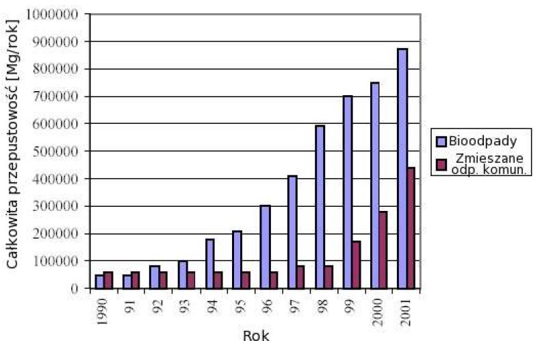 Rysunek 7. Porównanie przepustowości zakładów prowadzących fermentację bioodpadów i zmieszanych odpadów komunalnych w Europie w poszczególnych latach [35]