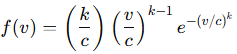 Kolejnym ważnym równaniem jest zależność pomiędzy średnią mocą turbiny a rozkładem prędkości wiatru. Ponieważ wiatr nie wieje cały czas z jednakową prędkością, stosuje się statystyczne modele opisujące rozkład prędkości wiatru, najczęściej rozkład Weibulla. Jego równanie opisujące prawdopodobieństwo wystąpienia danej prędkości wiatru ma postać: