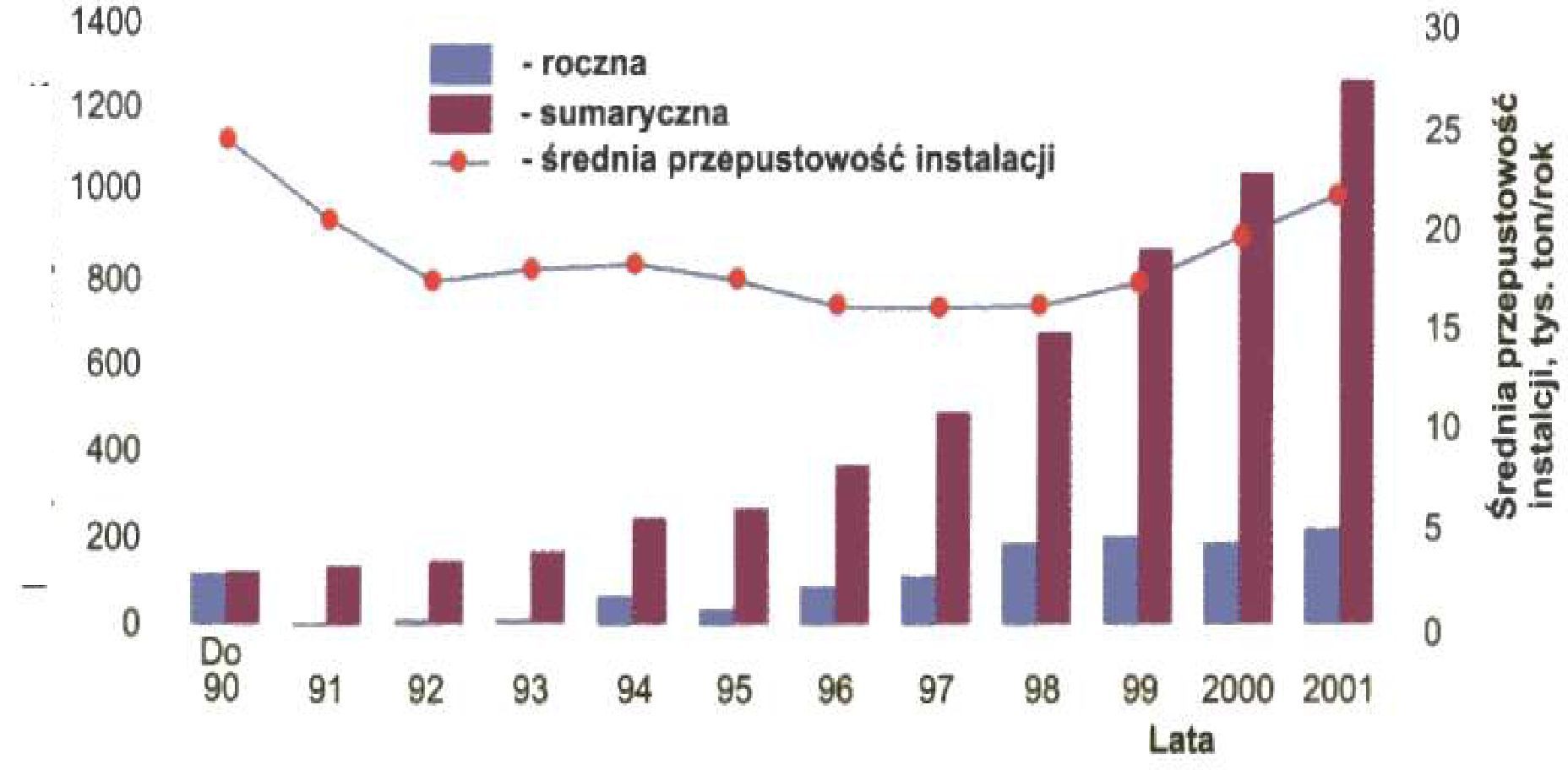 W ostatnich latach, szczególnie od 1996 roku nastąpił w Europie gwałtowny wzrost ilości odpadów unieszkodliwianych w obiektach fermentacji metanowej [Rysunek 19]. Przepustowość obiektów beztlenowego unieszkodliwiania odpadów w Europie stanowi około 5% całkowitej przepustowości kompostowni. Kraje, w których ten udział jest największy to: Szwajcaria (26,6%), Holandia (15,6%) i Belgia (11,9%) [18].