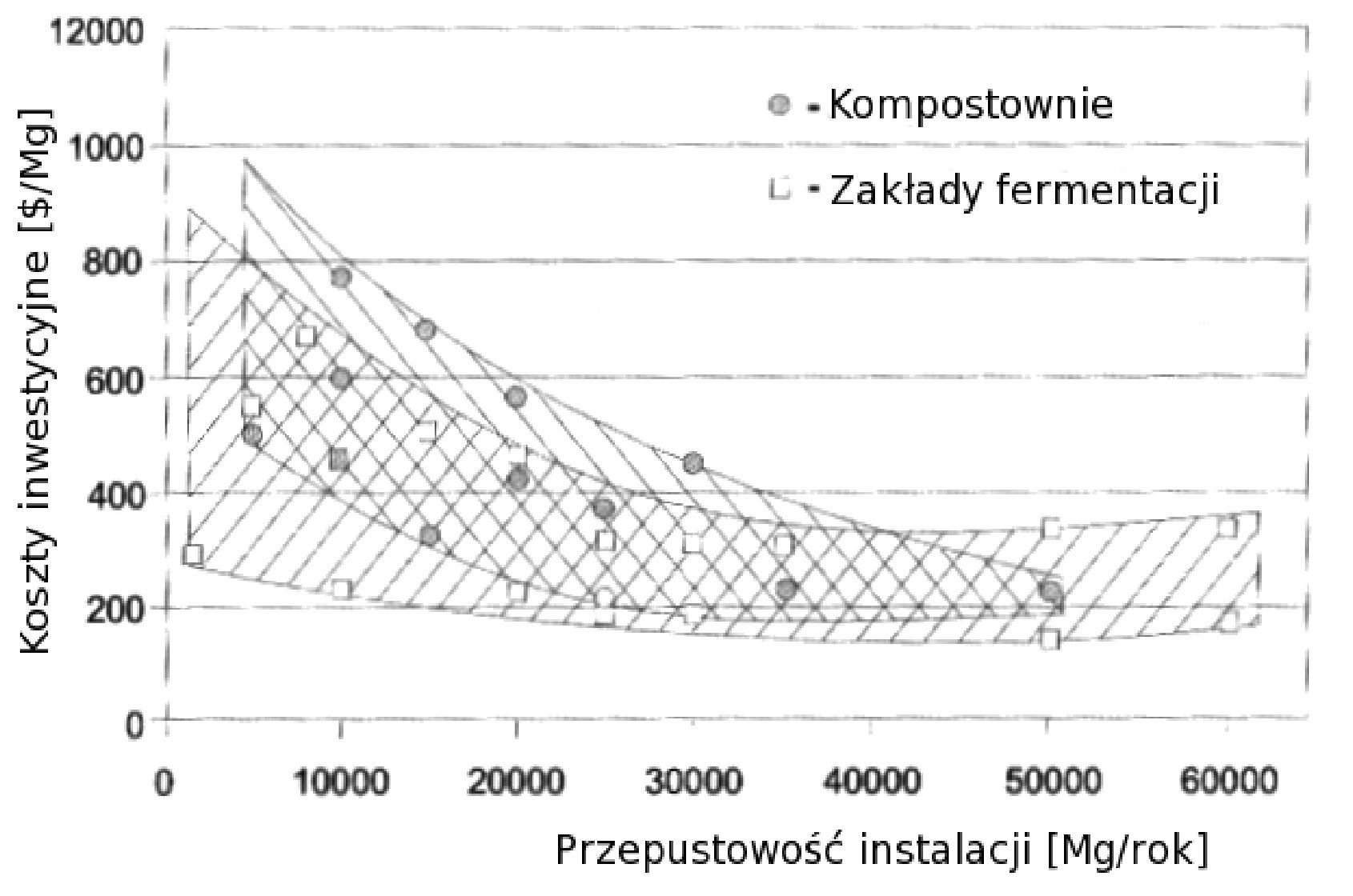 Koszty inwestycyjne i eksploatacyjne zakładu fermentacji metanowej są zależne od jego przepustowości oraz zastosowanej technologii. Generalnie dla małych obiektów są one większe niż dla kompostowni o podobnej wielkości. W przypadku obiektów o przepustowości powyżej 40000 Mg/rok koszty inwestycji kompostowania i fermentacji są porównywalne [Rysunek 20]. Duża rozpiętość kosztów instalacji o tej samej przepustowości wynika zazwyczaj z różnego wyposażenia technicznego.