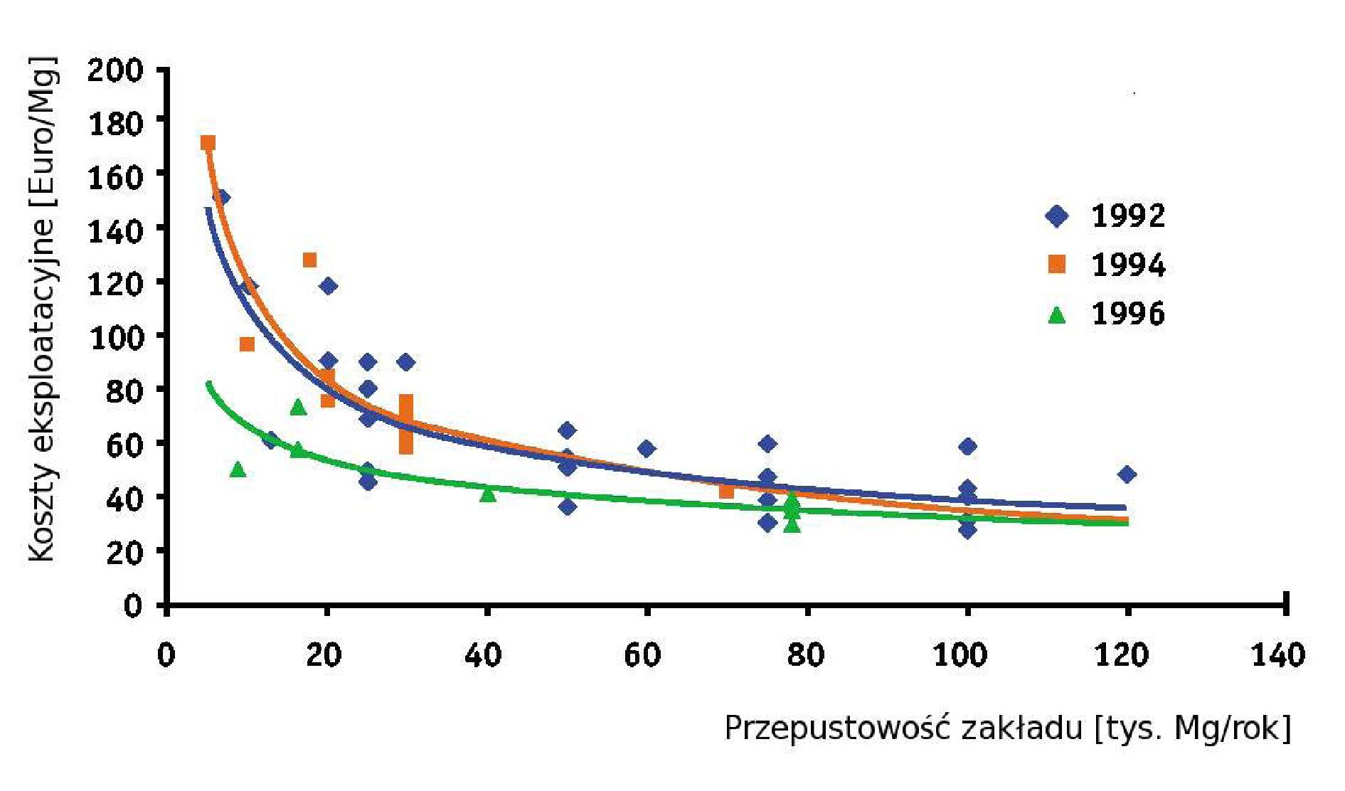korzystniejsze dla technologii fermentacji metanowej. Rozkład kosztów eksploatacyjnych w zależności od przepustowości instalacji dla lat 1992-1996 przedstawiono na Rysunku 21.